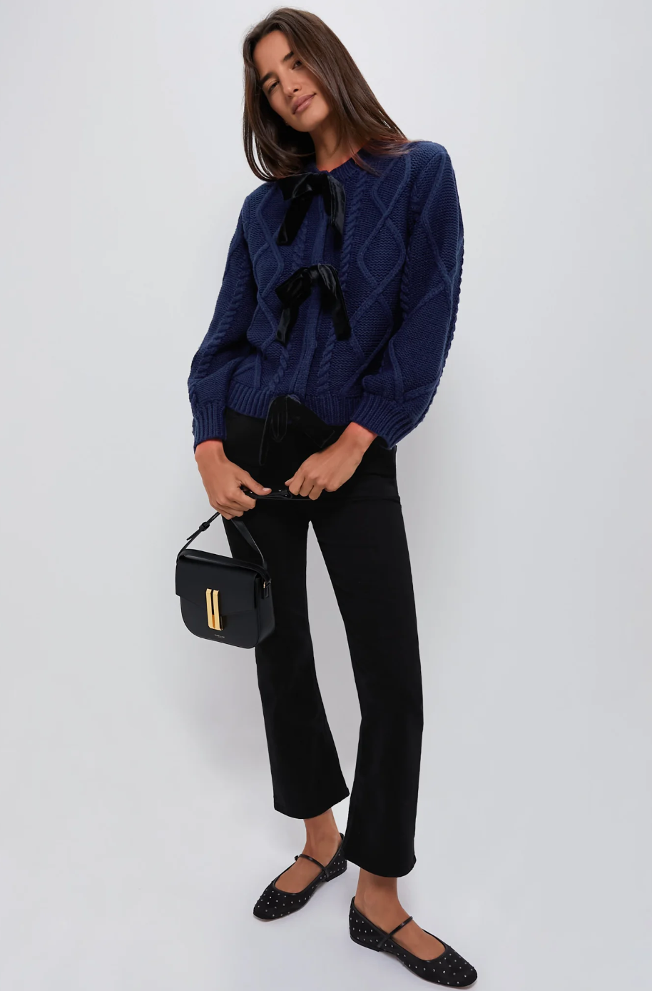 This velvet bow-adorned cardigan combines the softness of chunky knits with a touch of glam, making it perfect for colder climates. Layer it over a midi skirt for an elevated winter outfit or pair it with blue jeans for a chic yet relaxed look. It’s the ideal mix of comfort and style for those special occasions.