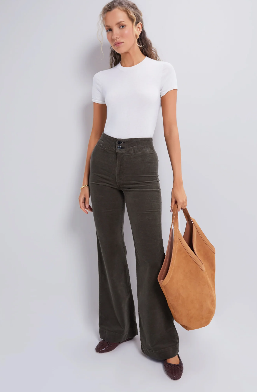Corduroy is back in style, and this safari green pair is a perfect addition to your winter capsule wardrobe. Its rich texture and flattering cut make it a standout piece for everyday wear during the colder months. Pair it with a long coat and boots for a stylish, warm look that transitions seamlessly from day to night.