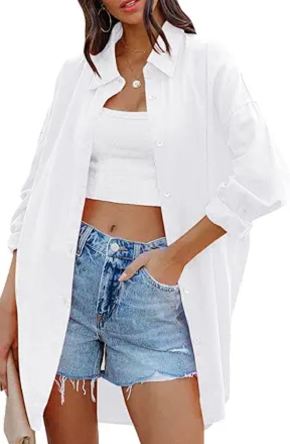 An oversized button-down you can layer over tanks or wear open like a lightweight jacket. If you don’t already own one, this is your sign.