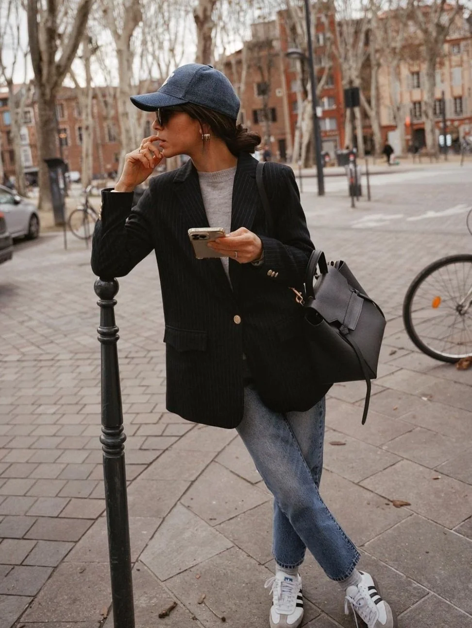 This is the ultimate "I’m busy but I look incredible" outfit. It takes the comfort of your favorite weekend staples a baseball cap and sneakers and makes them feel like a high-fashion choice by layering on a sharp, oversized blazer. It’s the perfect way to style those classic straight-leg jeans for a day of meetings or a city stroll.