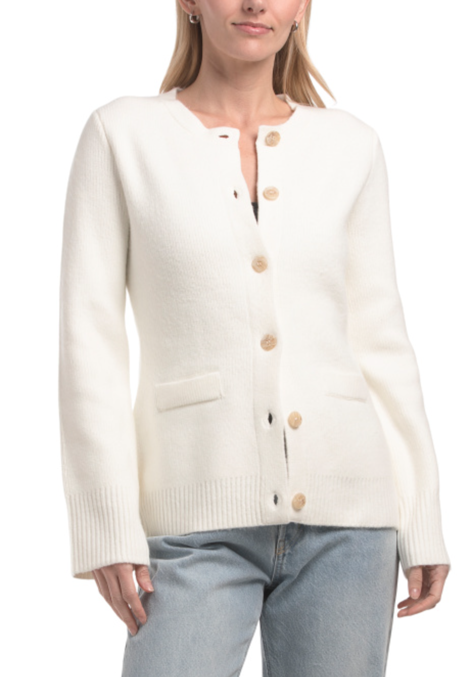 This is that “good sweater” you reach for when you want to look polished. It lays flat, looks structured, and pairs with everything.