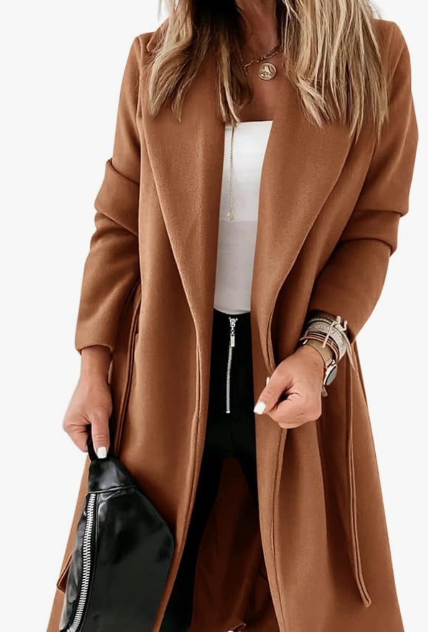 Womens Classic Coat Lapel Collar Open Front Belted Long Jacket
