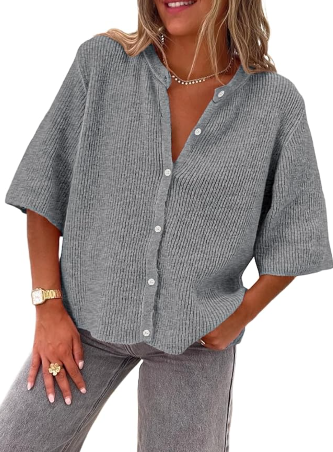 Lightweight Button V Neck Casual Knit Sweater