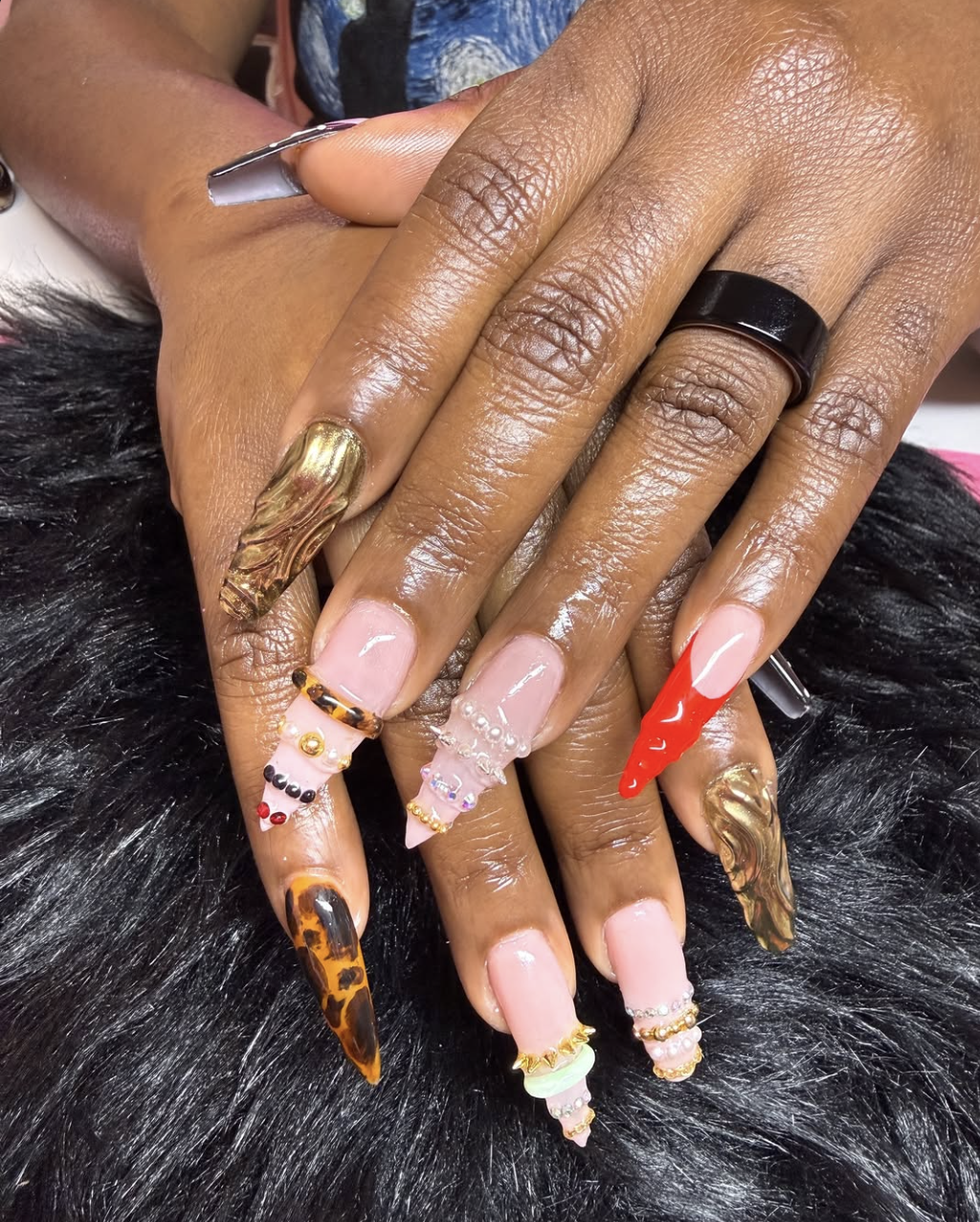 This design brings a high-fashion, "botanical-meets-industrial" energy to the trend. It features a striking combination of deep moss green with a subtle snakeskin texture and warm, translucent tortoise shell accents. The "bangle" elements are bold and structural, using chunky 3D gold bands that wrap around the nails like heavy brass hardware. To finish the look, the tech added delicate gold chains and micro-beading, creating a layered jewelry effect that feels both organic and incredibly luxurious.