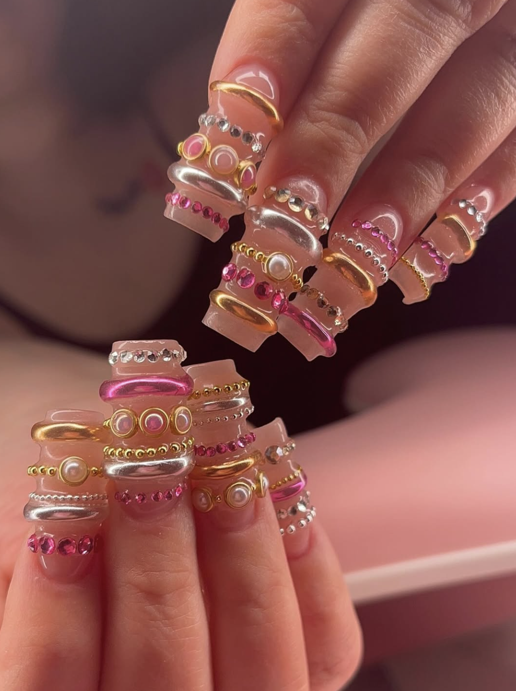 This set is a case study in layering, using a vibrant mix of fuchsia, bubblegum, and rose gold. The "bangle" effect is achieved by stacking different 3D mediums: thick translucent jelly bands that look like resin jewelry, paired with metallic gold rings and rows of sparkling pink rhinestones. The sheer variety of textures on each nail creates a stacked-bracelet look that feels playful, bold, and undeniably Y2K-inspired.