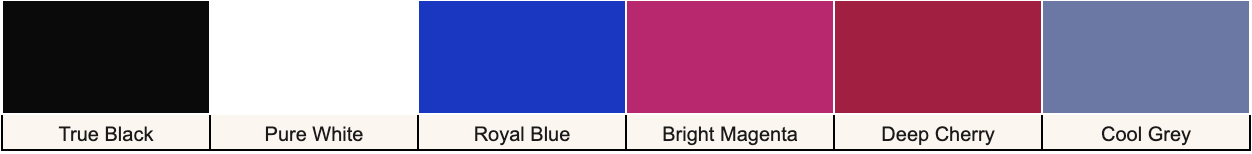 Pure black, pure white, royal blue, vivid magenta, deep cherry red, cool grey, cobalt, hot pink. True Winter coloring can carry the highest contrast combinations — black and white, vivid jewel tones, and strong cool brights.