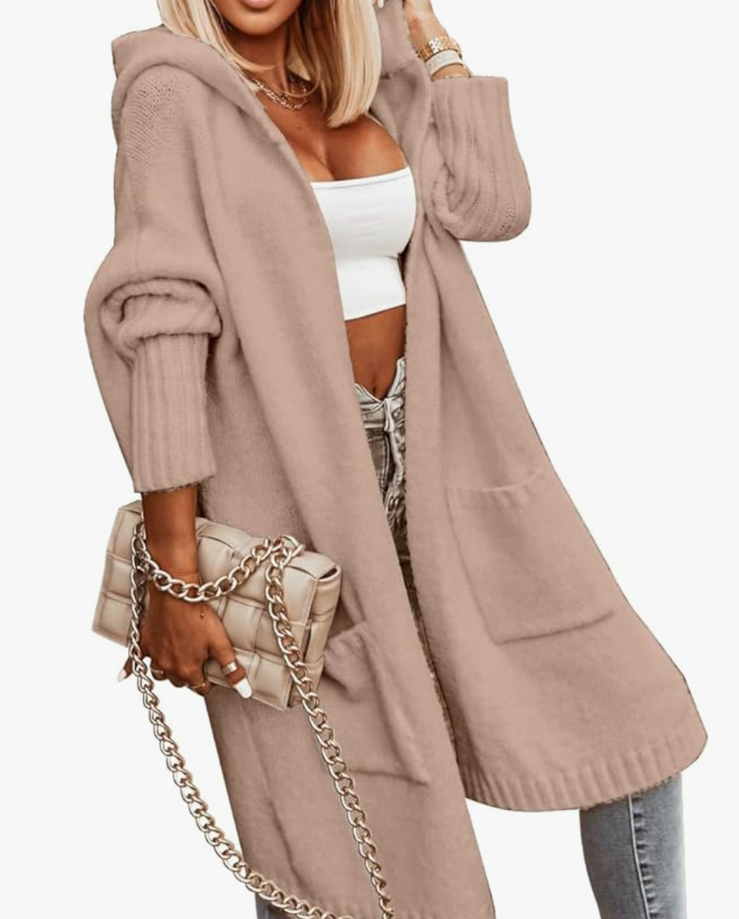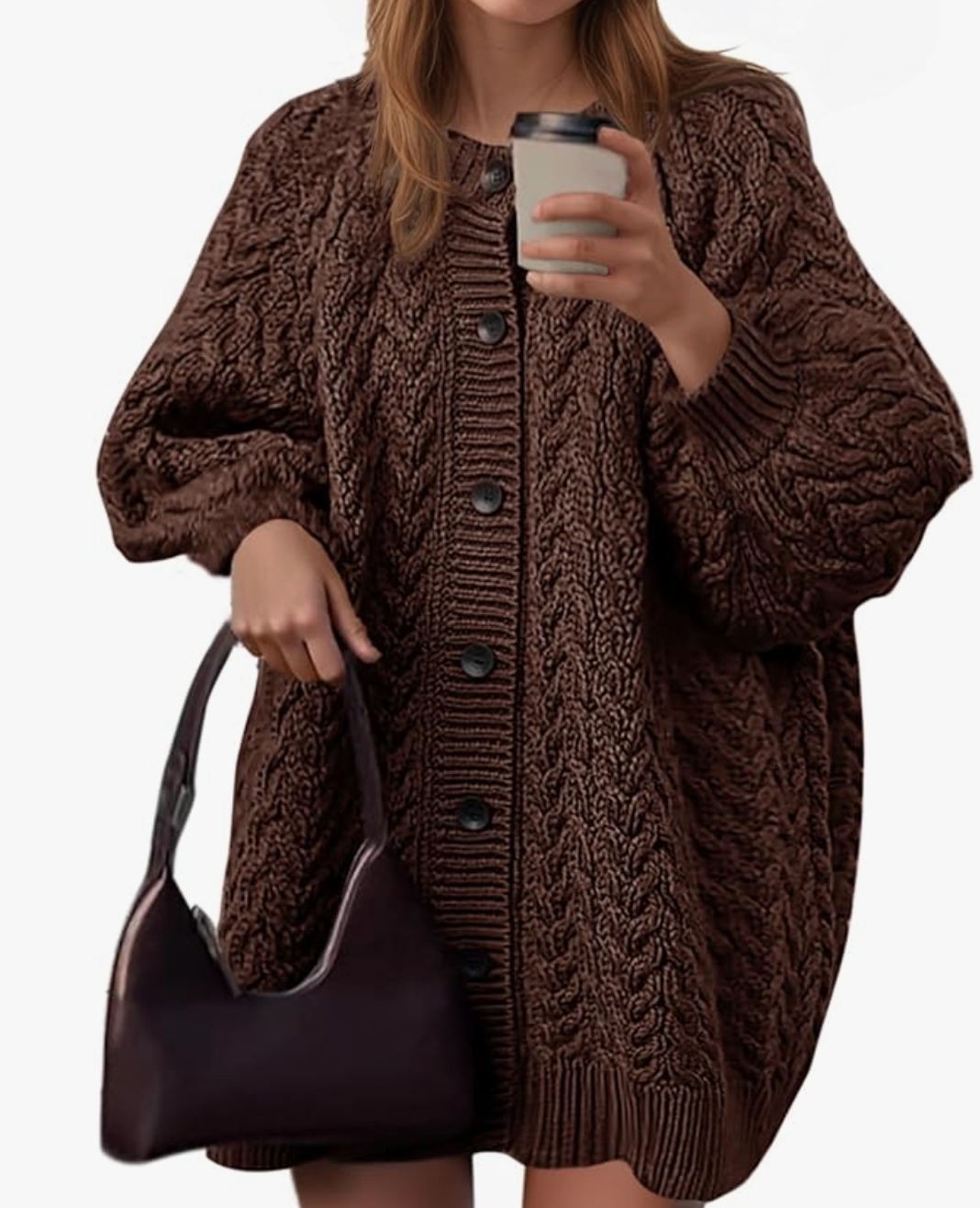 Wear a long-sleeve tee, layer a chunky cardigan for warmth, then top with a wool coat. A perfect cozy winter outfit idea when you’re tired of sweaters.