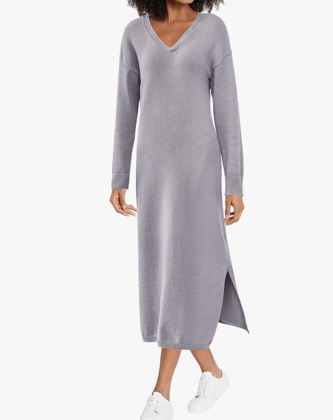 V Neck Long Sleeve Slit Knit Oversized Sweater