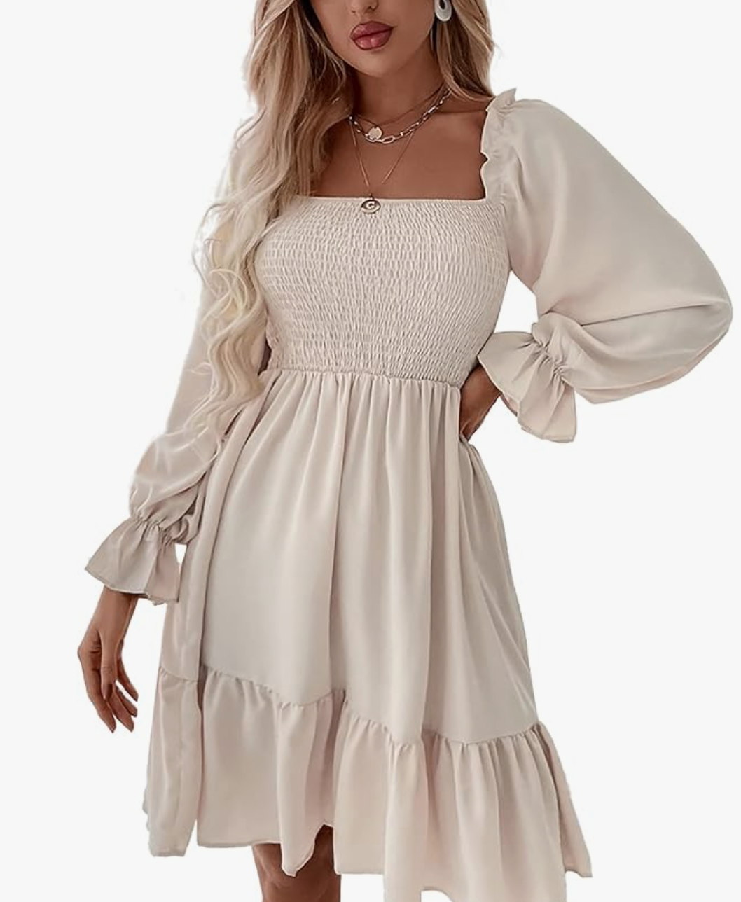 Long Sleeve Ruffle Shirred Flowy Party Mini Dress