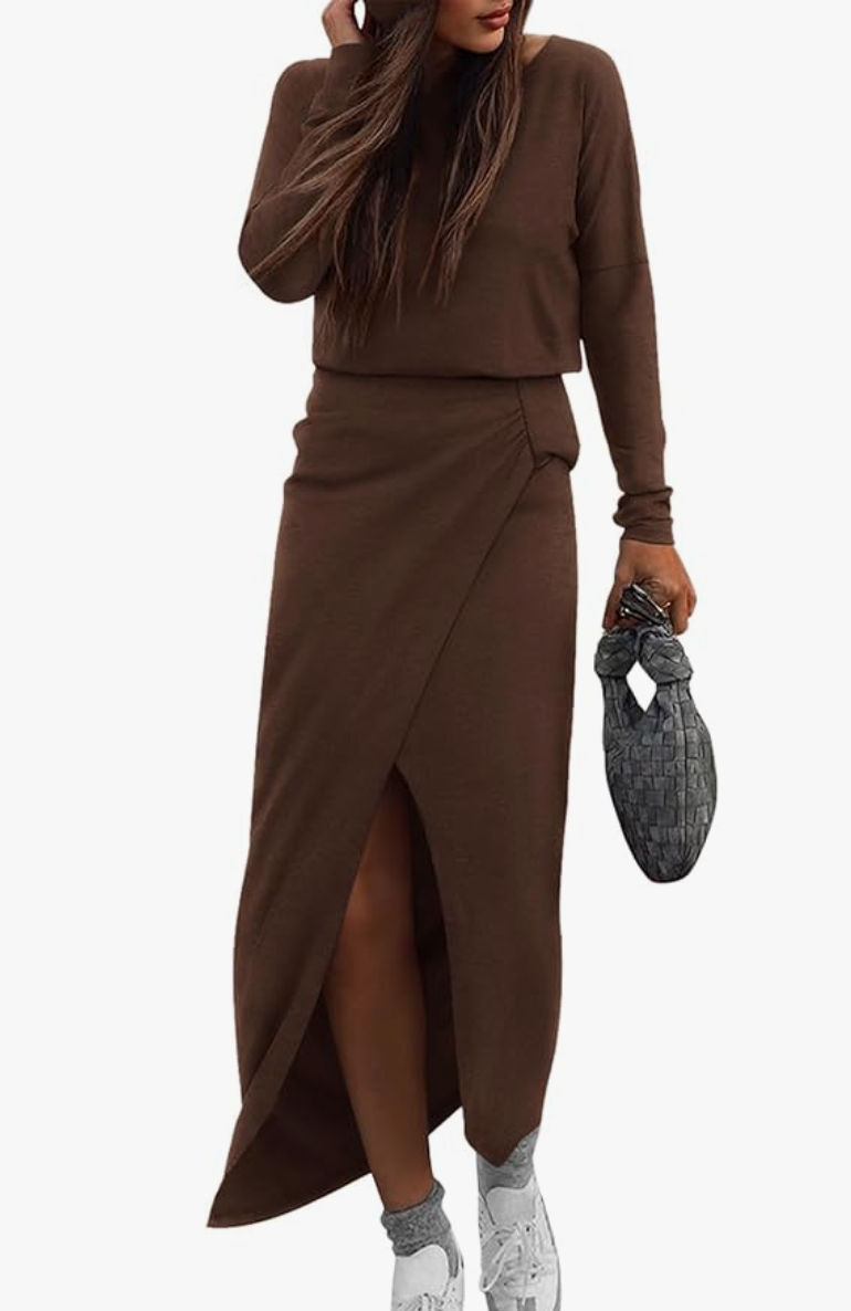 Midi skirt, tall boots, sweater casually tossed over your shoulders. Done. This is the brunch outfit that looks intentional but took less effort than deciding between pancakes or avocado toast.