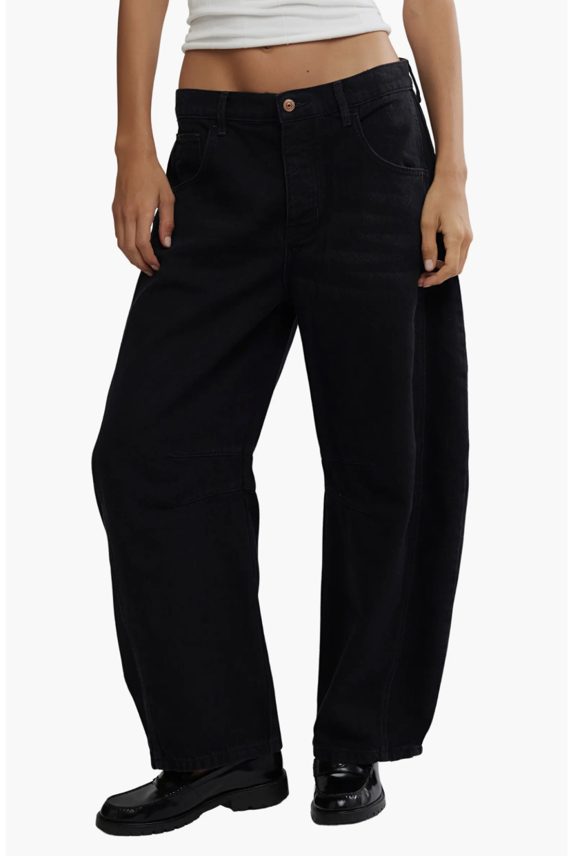 Barrel jeans are roomier through the thigh and curve slightly before tapering at the ankle. Straight-leg jeans maintain the same width from hip to hem. Barrel jeans feel more relaxed and sculptural, while straight-leg jeans look cleaner and more classic.