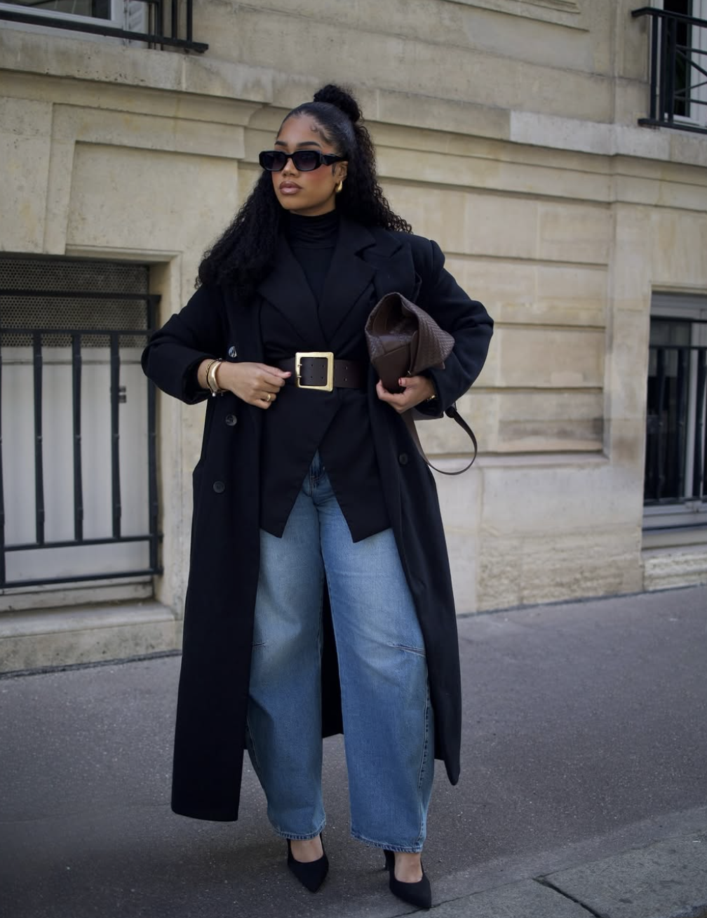 Layering barrel jeans works best when the structure comes first. A belted blazer defines the waist and anchors the outfit, while a trench layered over top adds length without overwhelming the silhouette. The belt keeps the volume controlled through the middle, and the long outer layer creates a clean vertical line that balances the curve of the jeans. Finished with heels, this formula makes barrel jeans feel elevated, intentional, and sharply styled rather than bulky.