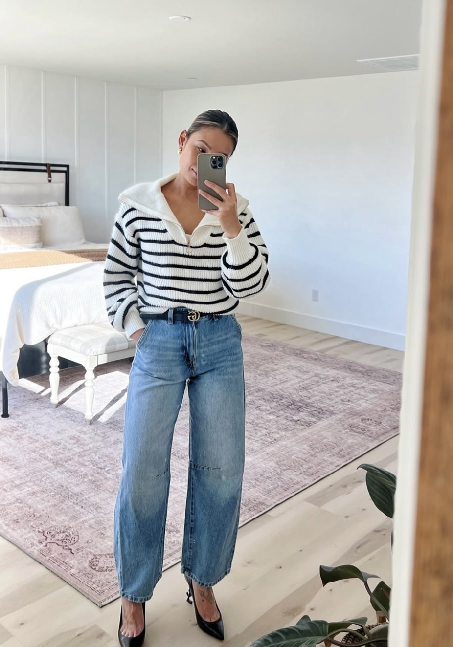 The issue isn’t the jeans themselves. Barrel jeans are designed with volume through the leg, which means the outfit has to do a little more work to feel balanced. When the proportions are right, they look intentional, flattering, and polished. When they’re not, the outfit can feel heavy or unfinished.