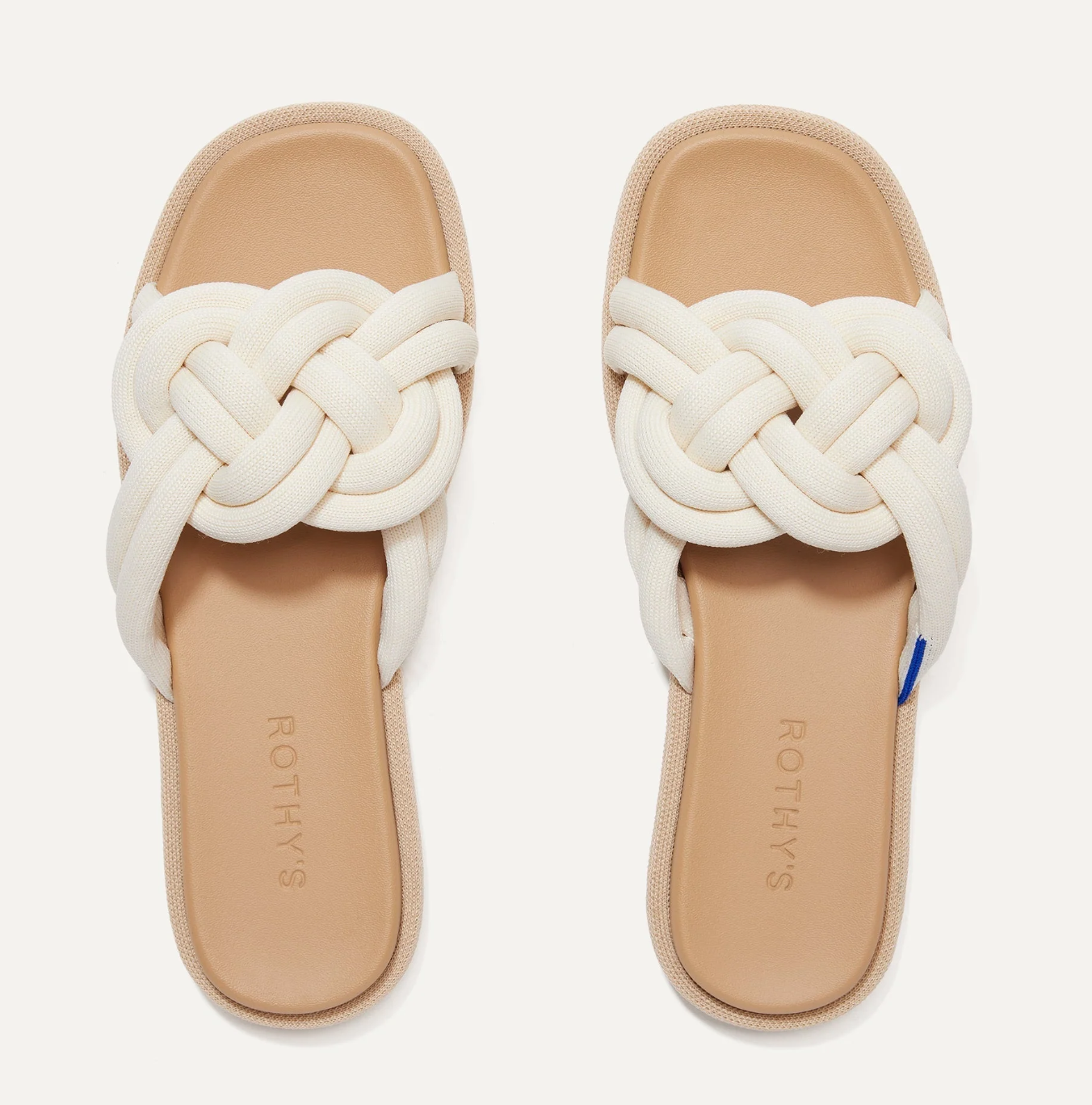 7. Off-Shoulder Top + White Jeans + Woven Slides