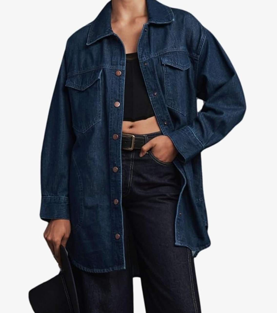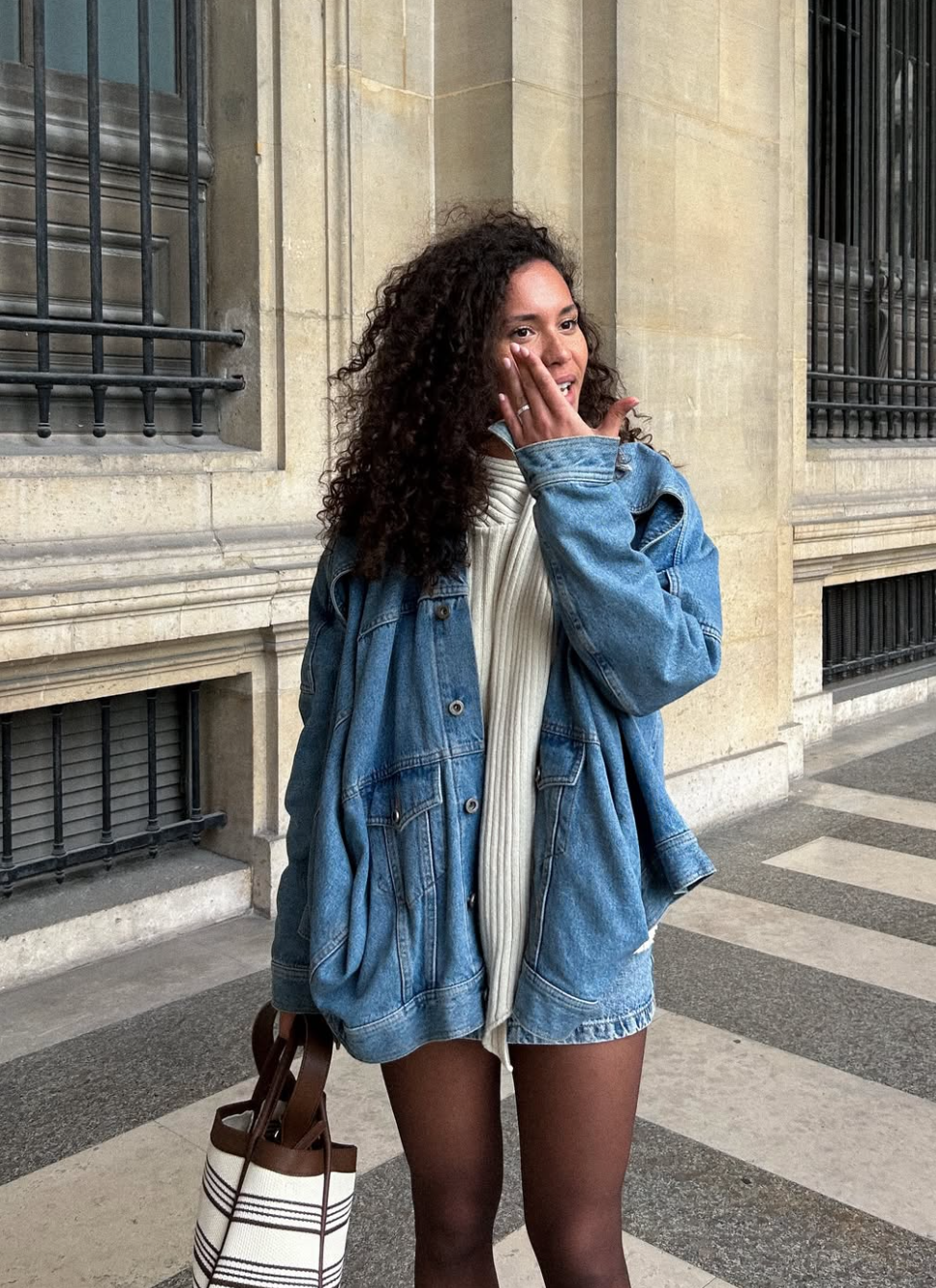 A longer denim jacket adds contrast to a shorter hemline — a combo that always looks modern and balanced.