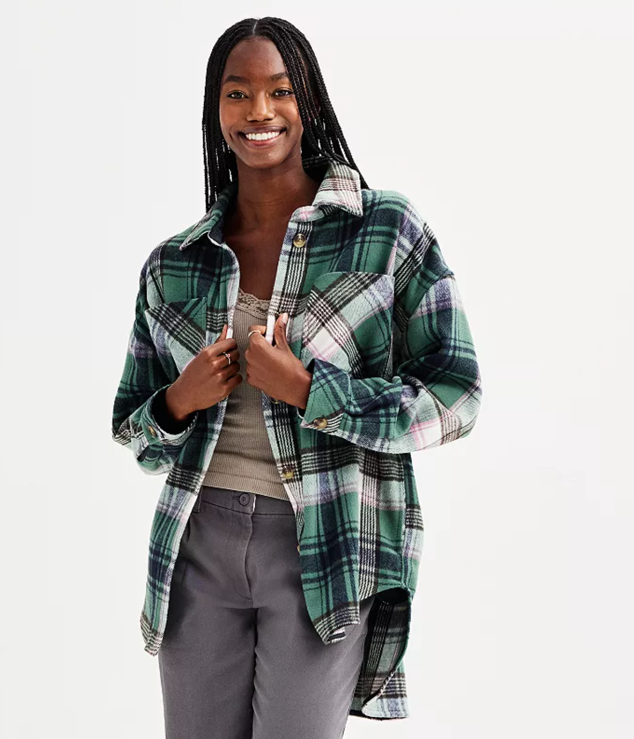 A shacket layered over a long-sleeve tee and leggings. Add a ball cap if you’re feeling mysterious.