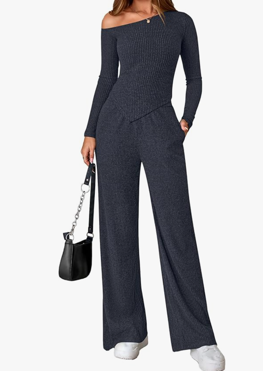 Asymmetrical Off Shoulder Tops Wide Leg Pants Knit Lounge Set