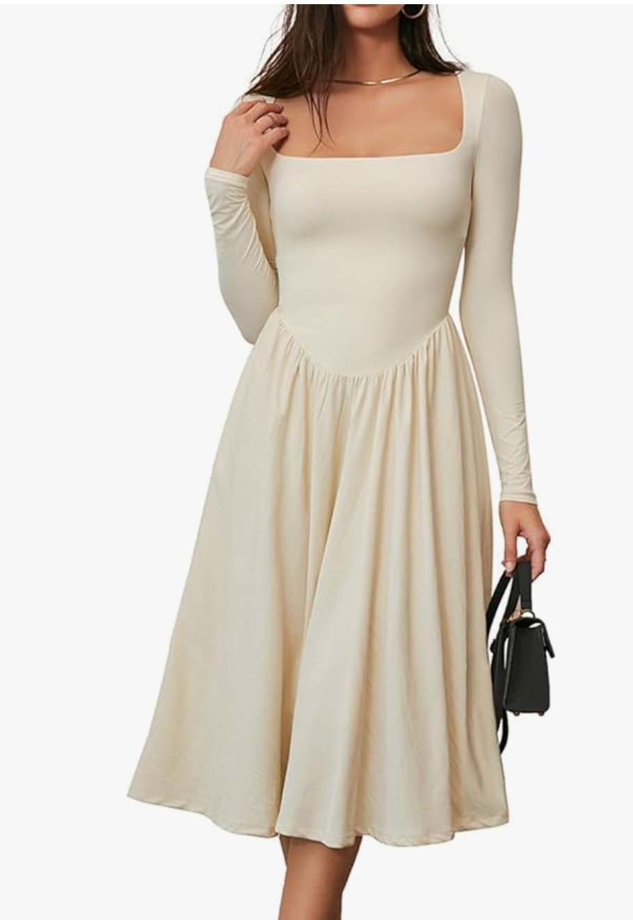 Square Neck Long Sleeve Casual A-Line Midi Dress
