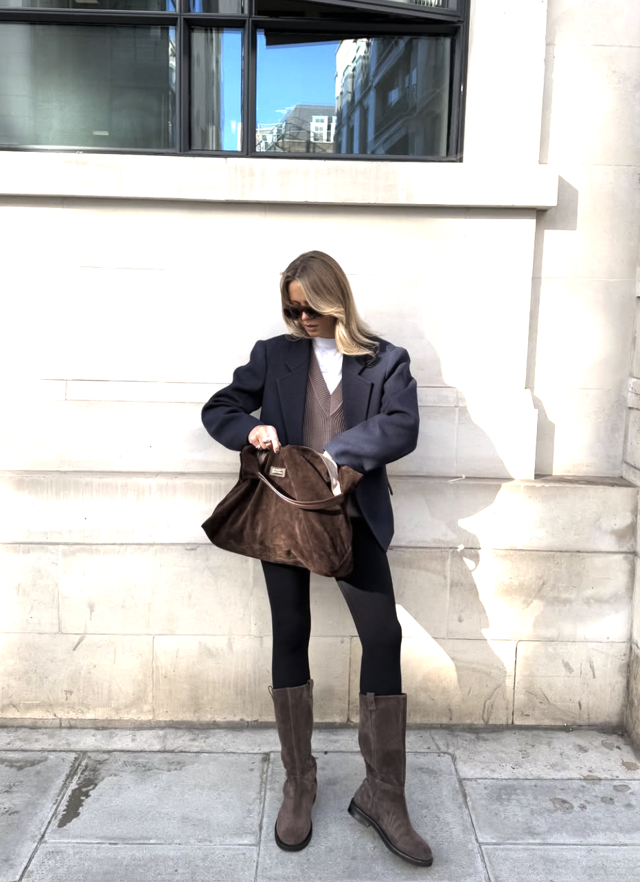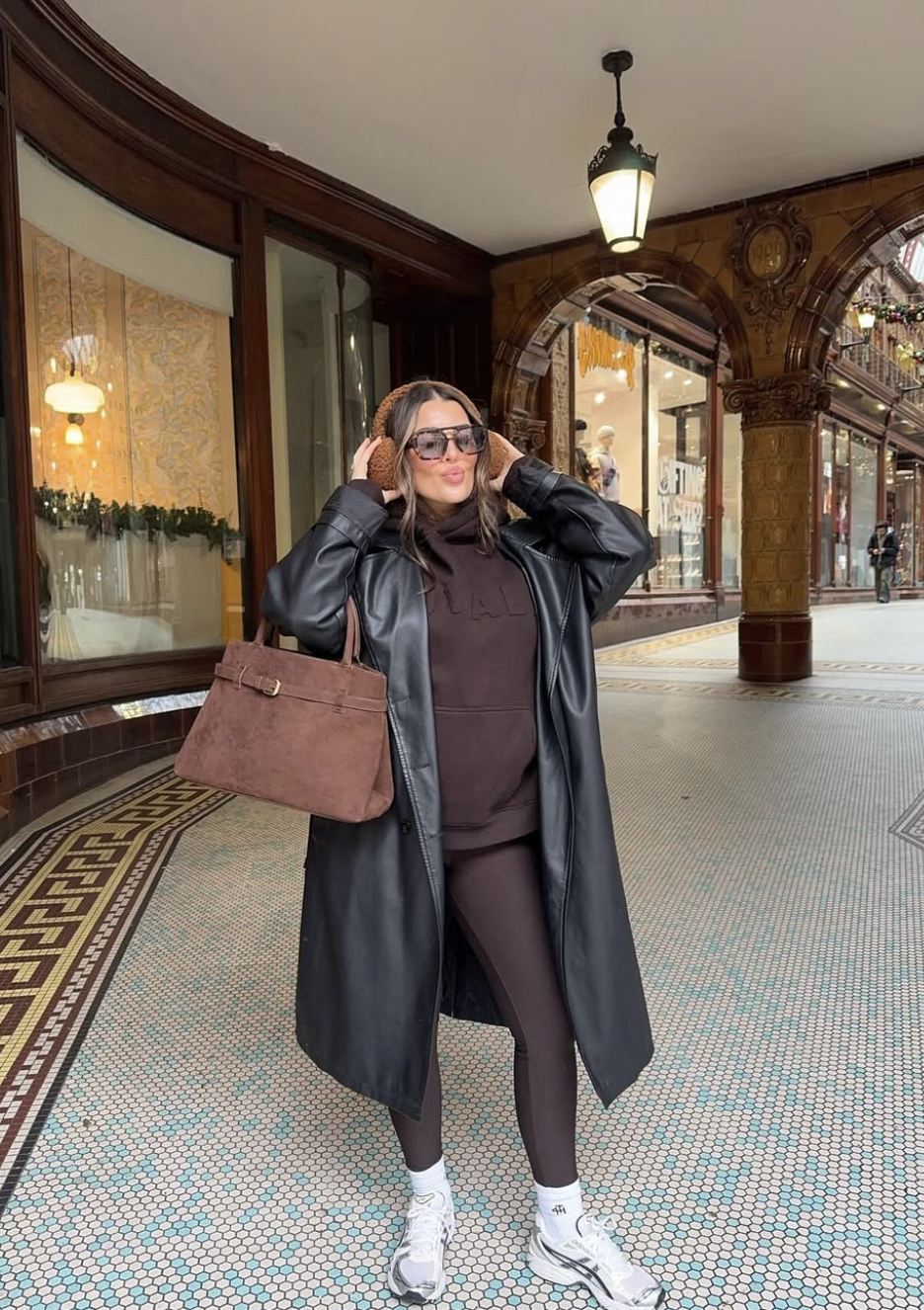 An oversized sweater instantly balances the slim fit of leggings while keeping the look intentional rather than sloppy. The key is choosing a knit with some structure at the shoulders or neckline so the outfit feels styled, not like loungewear. Brown leggings ground the volume on top and make this combination easy to wear for errands, travel days, or casual coffee plans.