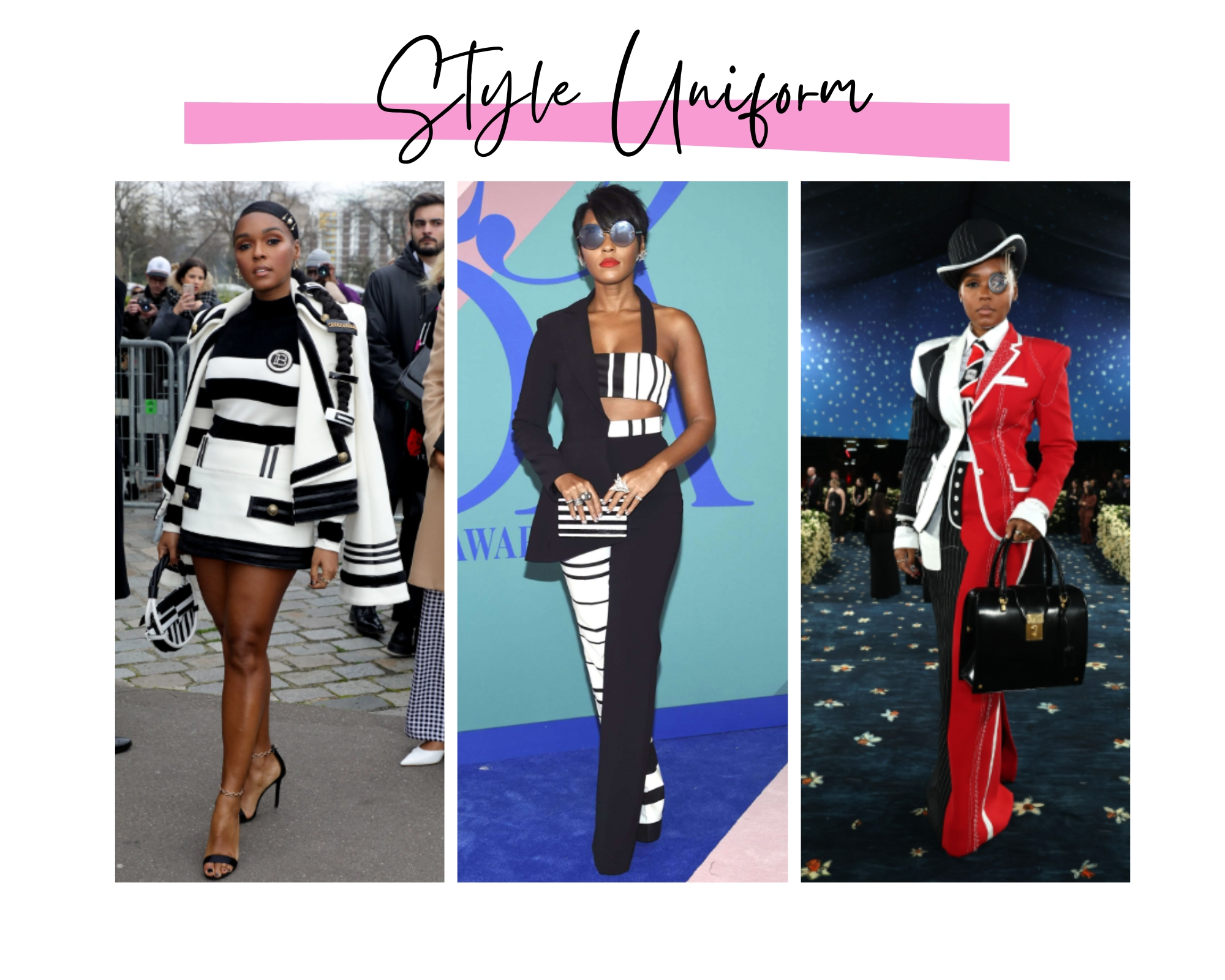 Same goes for Janelle Monáe. Early career: bow tie, suspenders, pompadour. Now: geometric shapes, bold color blocking, unexpected layers. The pieces change, but the essence stays.