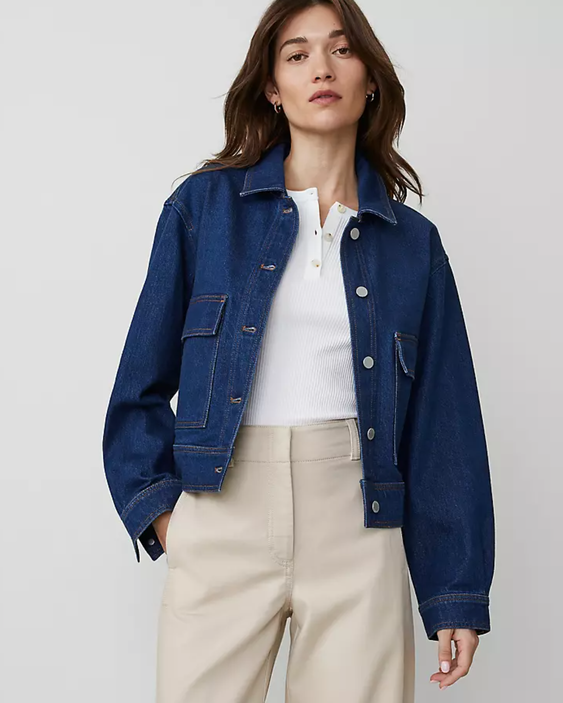 If you haven’t worn a denim jacket since 1998, it’s time to bring it back. A cropped cut balances out the skirt, and the whole look feels fresh, age-appropriate, and put-together.
