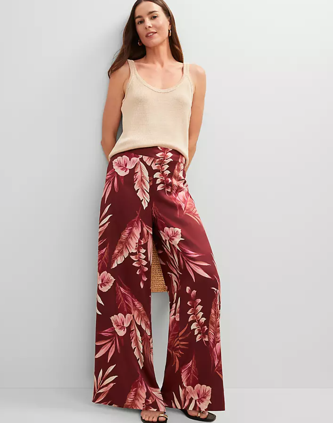 Studio Collection Dramatic Wide-Leg Silk Pant in Tropical Print