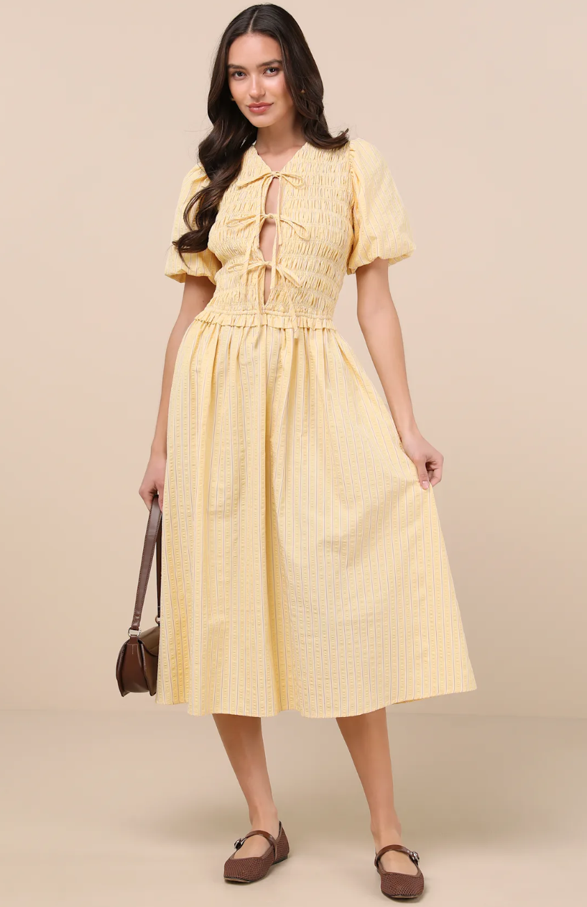 Sara Yellow Striped Smocked Puff Sleeve Midi Dress