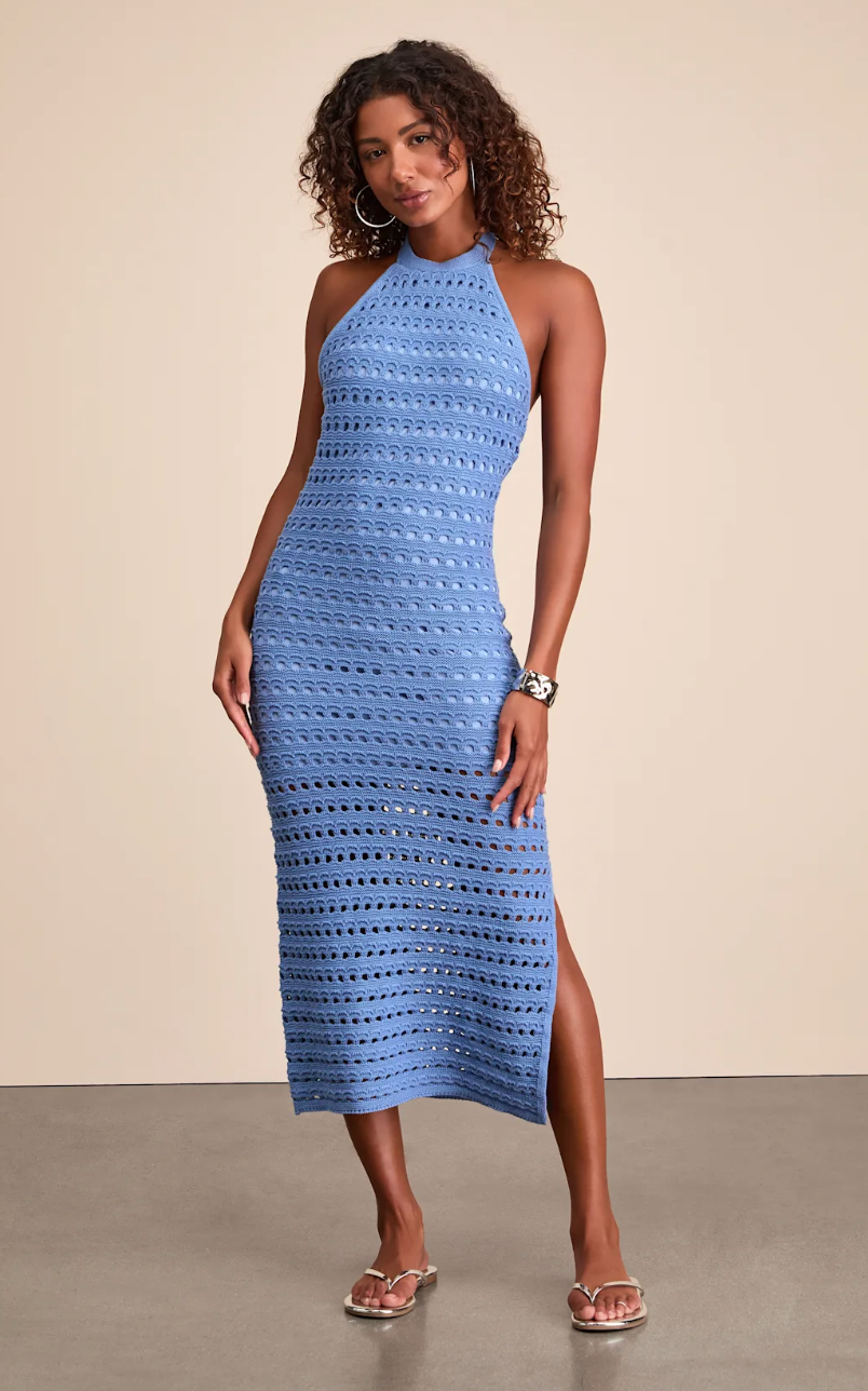 Calabria Periwinkle Blue Crochet Knit Halter Midi Dress