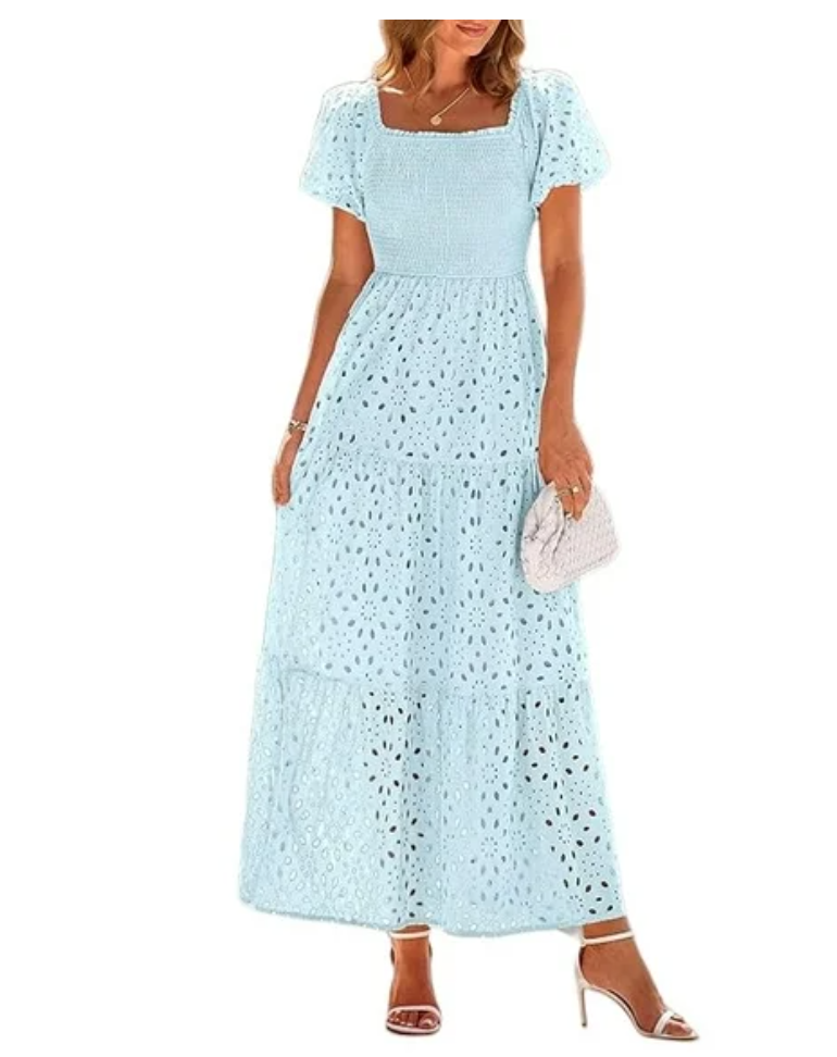 Eyelet Square Neck Puff Sleeve Smocked Dress