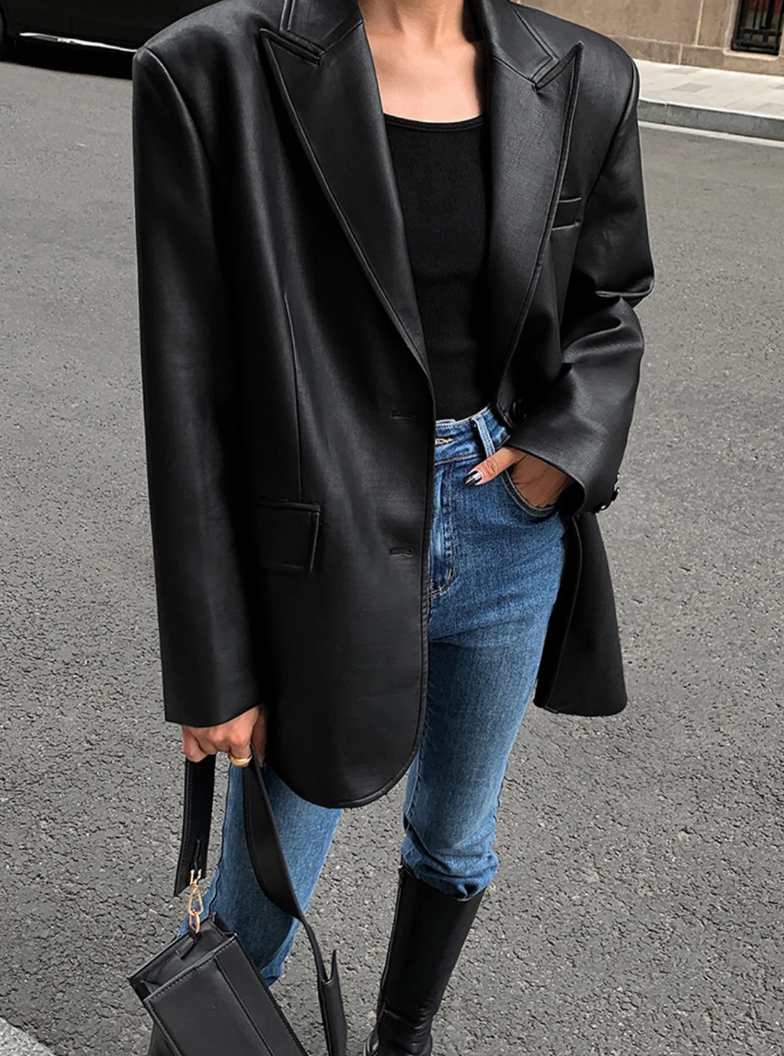2. Leather Blazer + Crewneck Sweatsuit + Hoop Earrings
