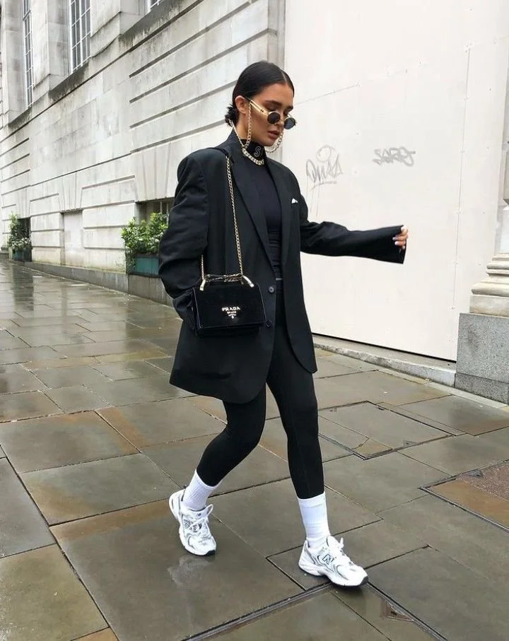 This pairing works because the contrast feels intentional rather than overly sweet, which keeps the look modern instead of juvenile. A simple dress anchors the outfit, while white sneakers add ease without stripping it of polish. The key is choosing streamlined silhouettes, since structure up top balances the casual shoe. This combination works especially well for busy days when comfort matters but you still want to look put together.