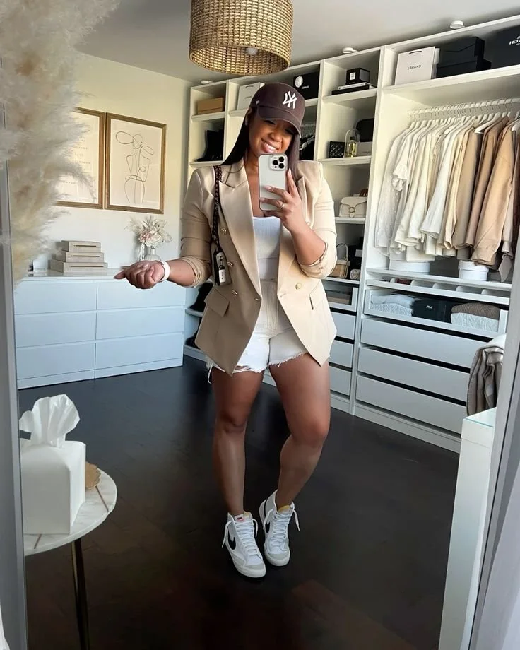 White sneakers and denim shorts are a summer staple because they balance comfort with an effortlessly pulled-together look. This combination works for errands, casual outings, and travel days since the sneakers keep the outfit grounded and walkable while the shorts keep it seasonally appropriate. A fitted tank, relaxed tee, or lightweight button-down instantly makes the outfit feel intentional rather than thrown on. Add a structured tote or sunglasses to keep the look polished without losing its ease.