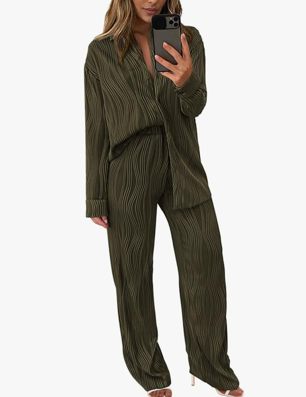 Textured Button Down Shirt Wide Leg Pants Outfit