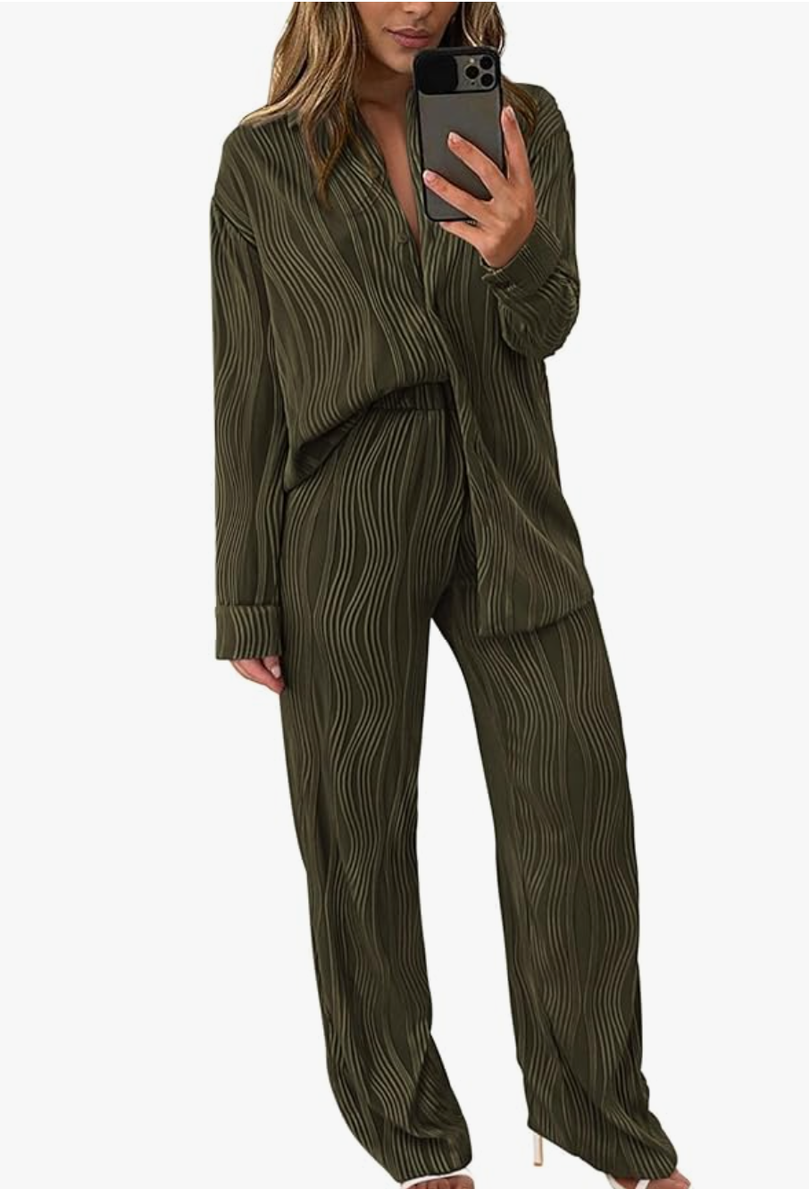 Textured Button Down Shirt Wide Leg Pants